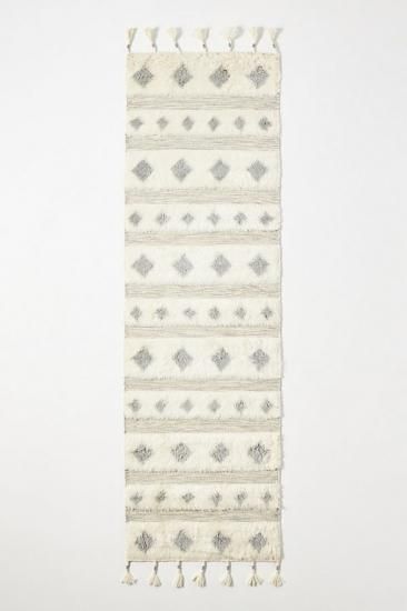 幾何学模様とタッセルの端が特徴のこの房状の敷物は、寝室やリビングスペースへの居心地の良い追加品です。