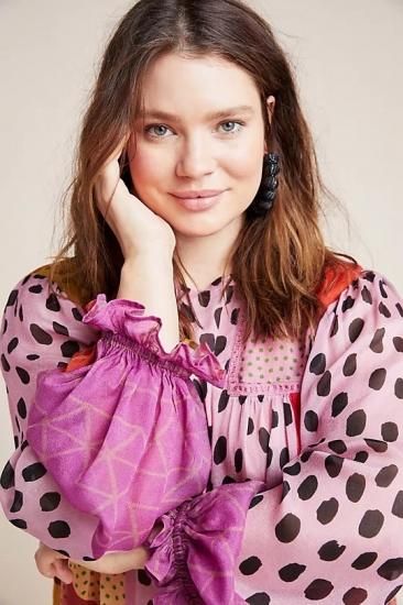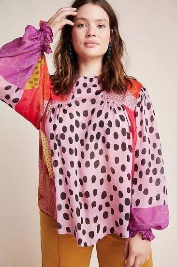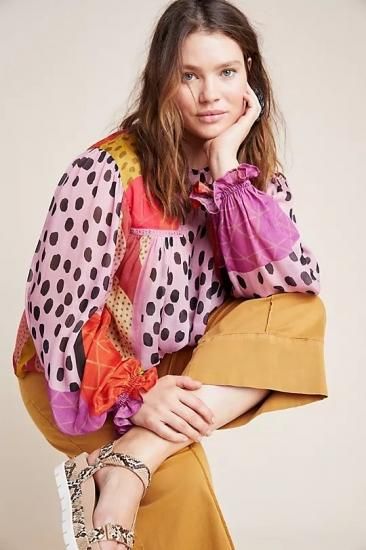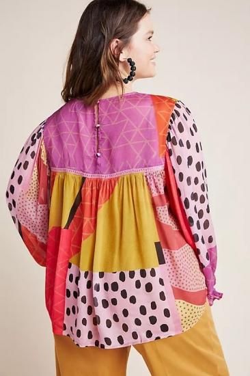 コントラストの効いた大胆なプリントが、ペザントブラウスをモダンに仕上げています。