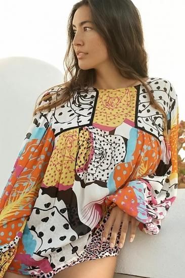 コントラストの効いた大胆なプリントが、ペザントブラウスをモダンに仕上げています。